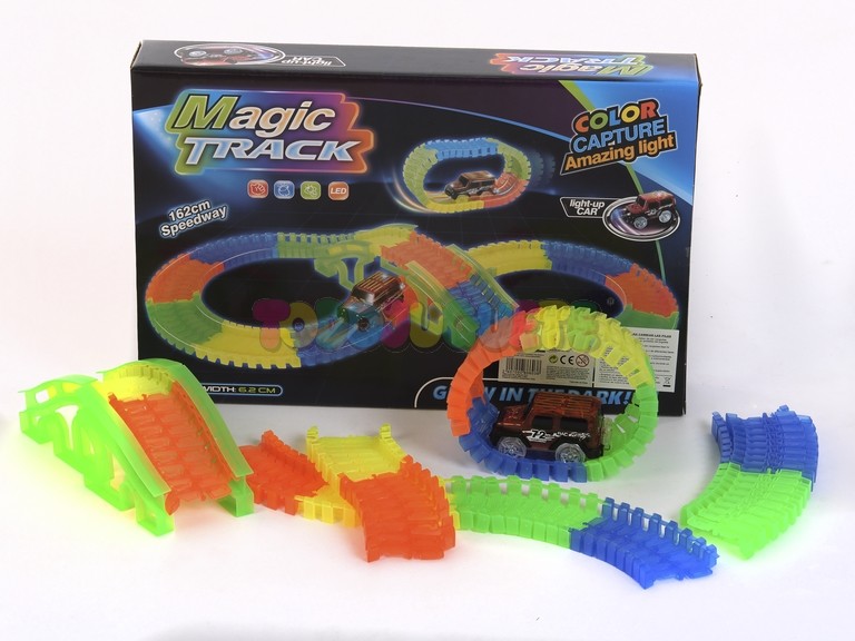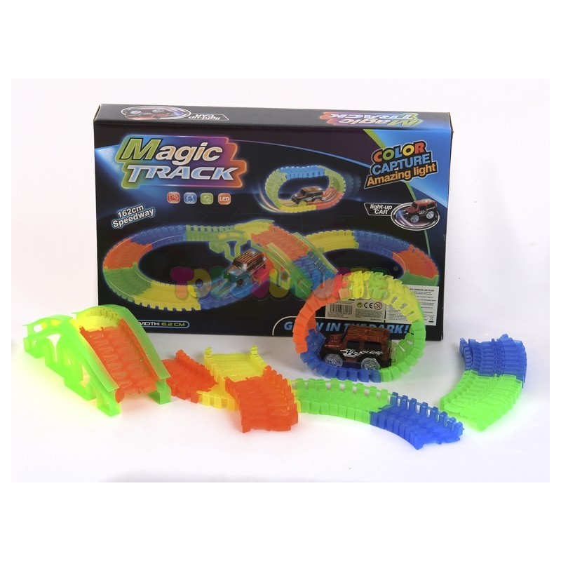 Diviértete con el Circuito luminoso de 162 cm y 133 piezas que brilla en la oscuridad, ideal para crear emocionantes recorridos llenos de color.