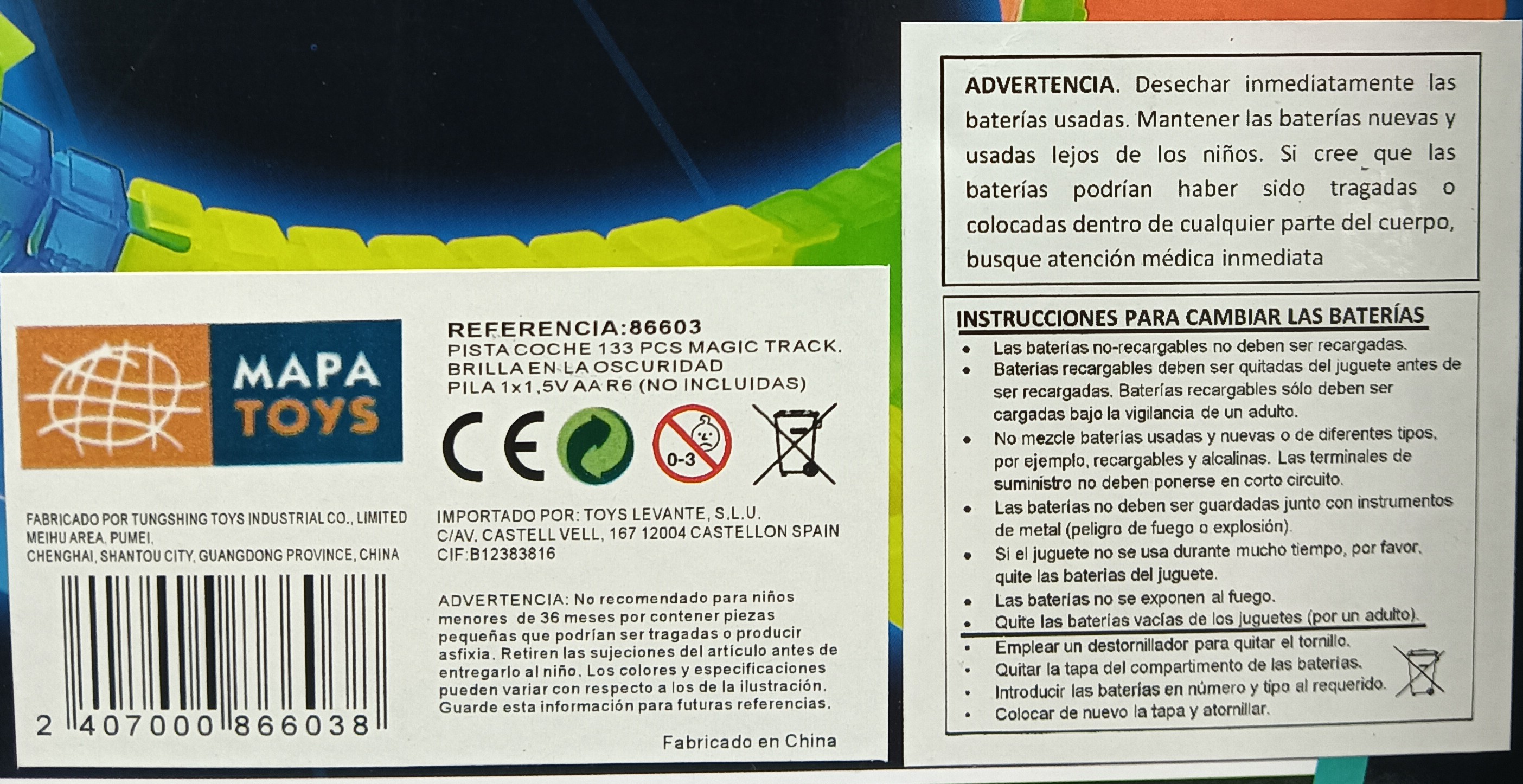 Incluye un vehículo con luz LED que ilumina el camino mientras corre por el circuito de 6,2 cm de ancho. Perfecto para fomentar la creatividad y la coordinación en los más pequeños. Funciona con una pila AA no incluida.