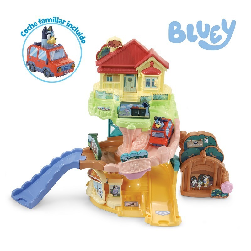 Bluey abre las puertas de su casa para que tu peque haga rodar el coche familiar por tres pisos llenos de sorpresas. Basta soltarlo por la rampa del tejado para ver cómo desciende, atraviesa la barrera y sale disparado hacia el parking o la gasolinera, donde los sensores mágicos activan frases, música y efectos que alimentan la imaginación y la causa-efecto. Cada giro de ventana, apertura de puerta o trampilla que levanta al pájaro invita a la coordinación mano-ojo y al juego simbólico: ¿Repostamos o subimos a la cabaña del árbol?. El robusto diseño se monta en minutos y es compatible con todo el mundo Tut Tut Bólidos, así que nuevas pistas y vehículos pueden unirse a la aventura cada día. Y con desconexión automática, la diversión es tan segura como duradera.