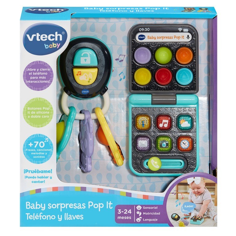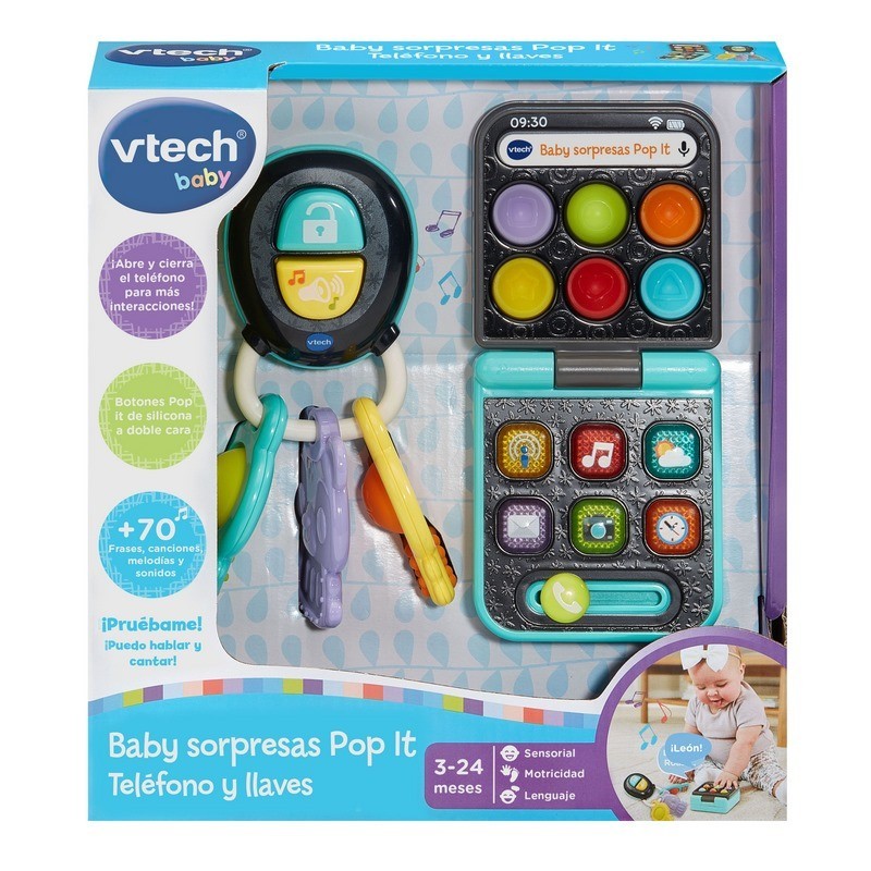 El Baby Sorpresas Pop It Teléfono y Llaves de VTech es un encantador pack diseñado para estimular los sentidos y habilidades motoras de los más pequeños. Inspirado en un diseño vintage con un toque moderno, este juguete interactivo combina funcionalidad y diversión para niños a partir de los 6 meses. El conjunto incluye un teléfono y un juego de llaves, ofreciendo múltiples actividades sensoriales y educativas.