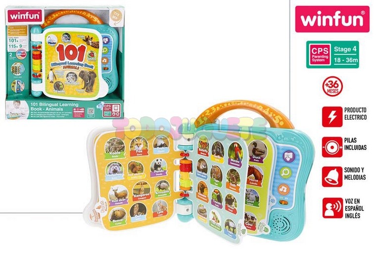 Este libro interactivo bilingüe de Winfun ayuda a los pequeños a descubrir 101 animales en inglés y español a través de páginas coloridas y sonidos divertidos. Con tres modos de juego (aprendizaje de nombres y sonidos, preguntas y música), fomenta el desarrollo del lenguaje, el razonamiento y la estimulación sensorial. Ideal para niños de 18 a 36 meses, es fácil de transportar gracias a su asa, lo que lo convierte en un compañero perfecto para aprender en cualquier lugar. Funciona con 2 pilas AA (incluidas). -Edad y valores:recomendado entre 18-36 meses. Etapa 4, clasificado bajo el concepto CPS Parenting System de Winfun. Estimula los sentidos y desarrolla el lenguaje y el razonamiento -Páginas desplegables llenas de color: el libro tiene ilustraciones brillantes con sonidos y melodías que animan a los peques a explorar -Descubre 101 animales en dos idiomas: aprender nunca fue tan divertido con nombres y sonidos en español e inglés -3 modos de juego interactivos: modo de aprendizaje (aprende los nombres de los animales y sus sonidos), modo pregunta (encuentra el animal correcto) y modo música (disfruta de melodías y sonidos divertidos) -Fácil de llevar a cualquier parte: asa de transporte integrada para que llevar el aprendizaje y la diversión a todas partes.