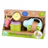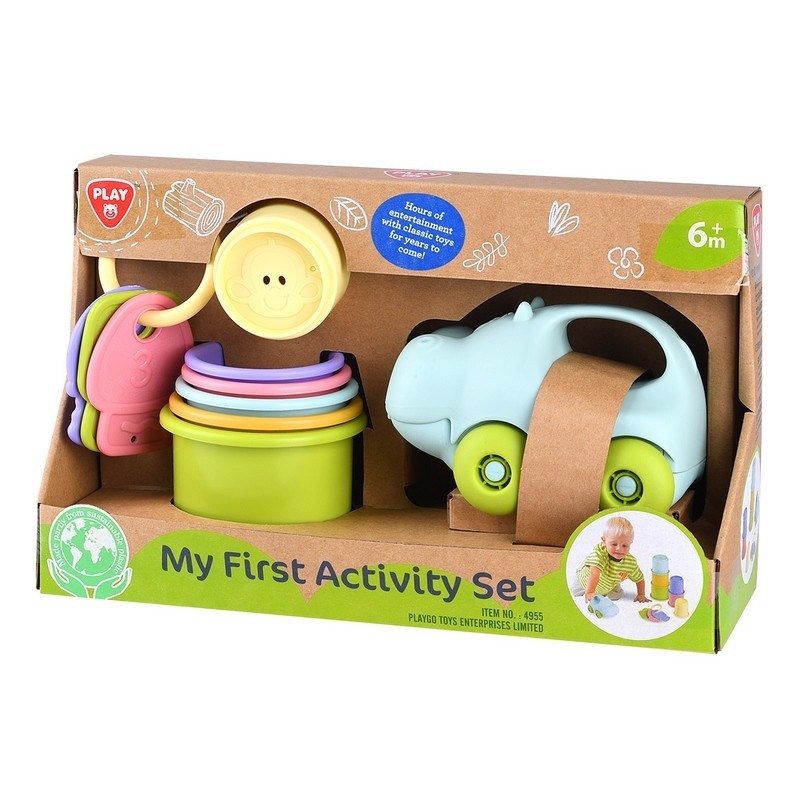 Incluye un coche con asa y rueda libre, seis vasos encajables y apilables para el baño o la playa, y un llavero con tres llaves, todo en colores suaves pastel. Cada pieza favorece el juego interactivo y el aprendizaje temprano de forma divertida y segura. Recomendado para bebés a partir de 6 meses.