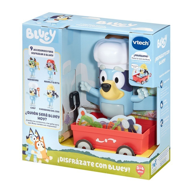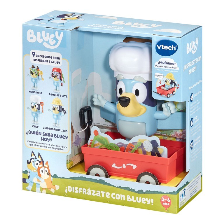 Bluey cobra vida y se transforma en chef, exploradora o abuelita según el accesorio que le coloques: en modo Disfraz cada gorro, gafas o la carretilla desencadena frases distintas y anima al juego de roles, soltando la imaginación. En modo Juegos invita a recrear los espárragos mágicos o a seguir sus movimientos en Sígueme, retando la memoria y la motricidad al mover sus brazos y apretar su nariz luminosa. Pasa a modo Música y baila mientras cambias melodías moviendo los brazos; pausa o añade divertidos efectos con la nariz, y prueba las canciones especiales que activa cada accesorio reconocido. La barriguita iluminada marca el ritmo y un selector permite ajustar volumen y elegir el modo. Con desconexión automática y diseño resistente, Bluey acompaña horas de disfraz, baile y fantasía, fomentando la expresión creativa y la coordinación mano-ojo en cada aventura.