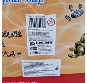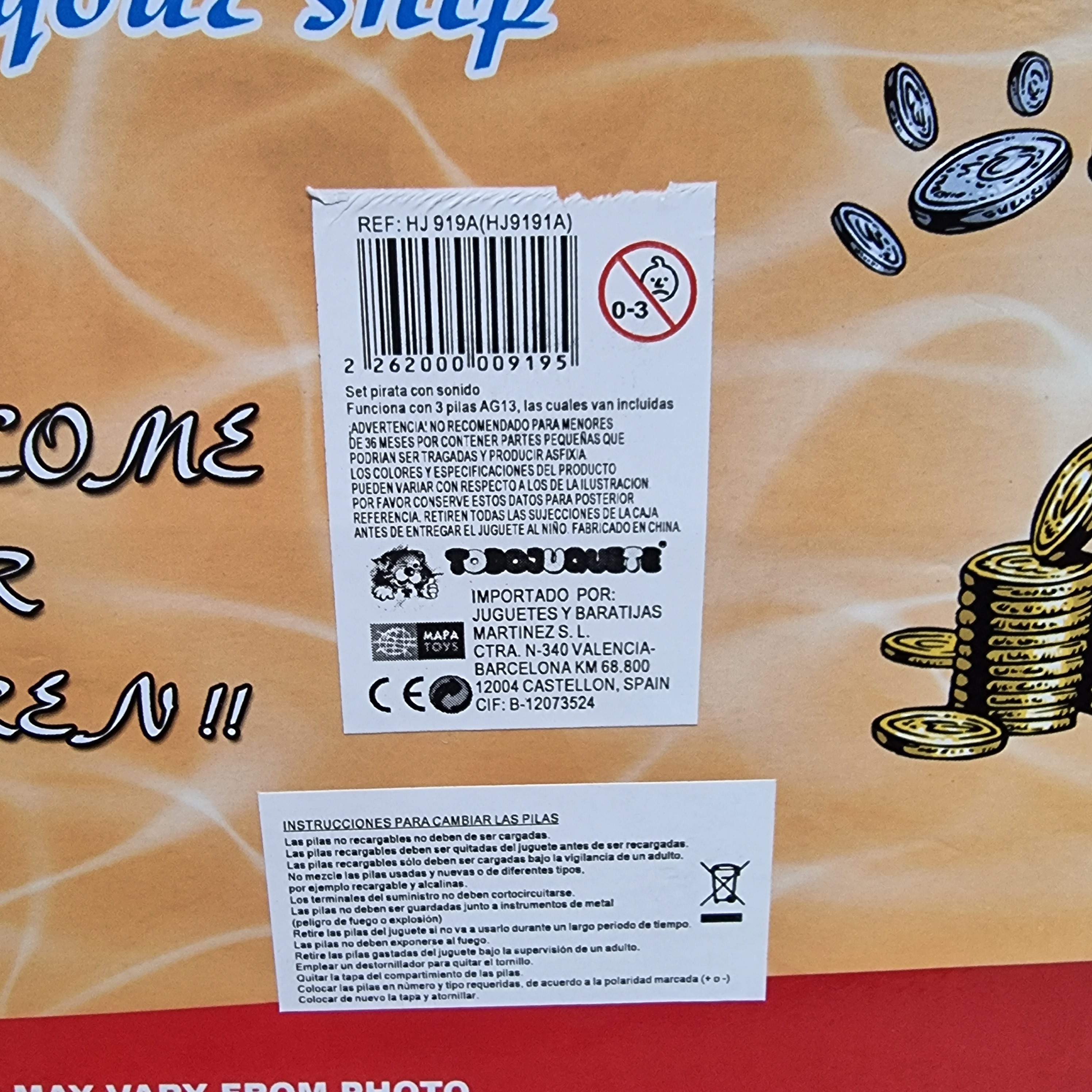 Incluye una espada de 58 cm, un trabuco de 28 cm, un telescopio monocular de 18 cm y dos medallas piratas, todo lo necesario para una aventura en alta mar.