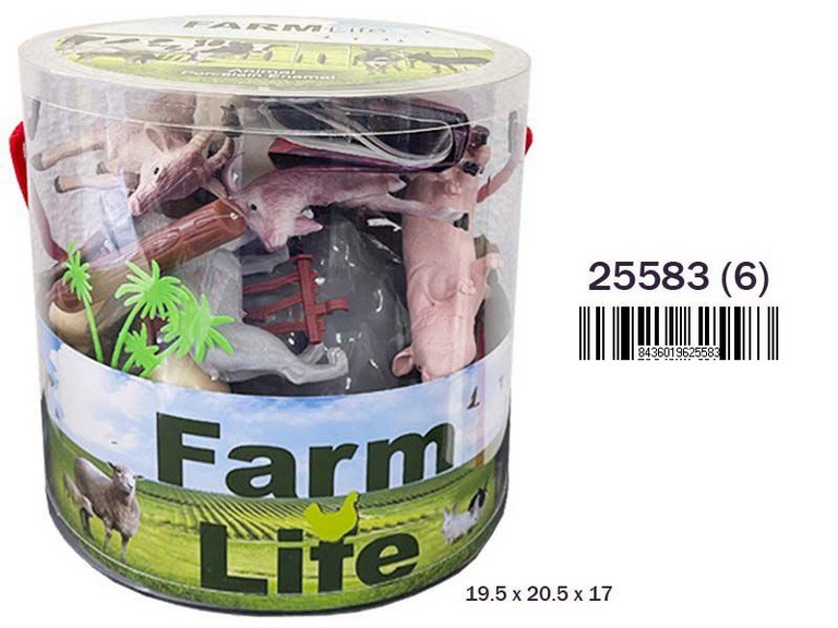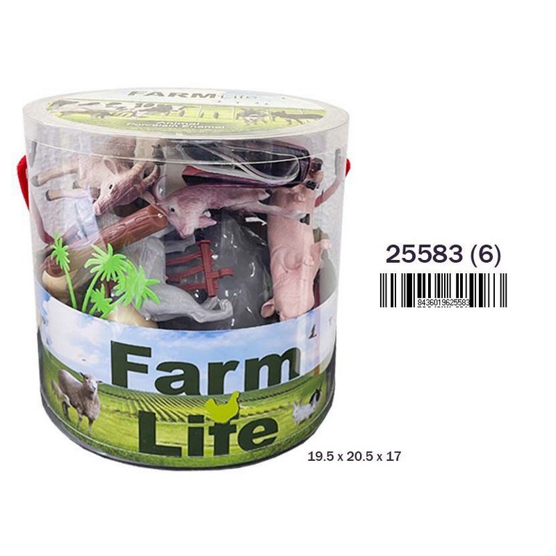 Bote con 34 piezas de animales de la granjay su hábitat.