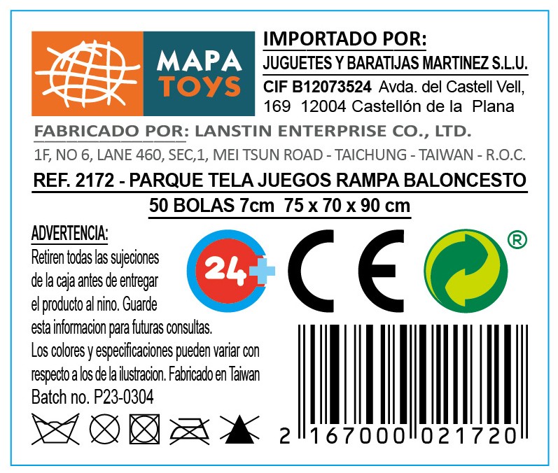 Diseñado para estimular el desarrollo motriz y la coordinación, incluye 50 bolas de colores de 7 cm de diámetro, una rampa con huecos para encajarlas y una canasta para jugar a encestarlas.