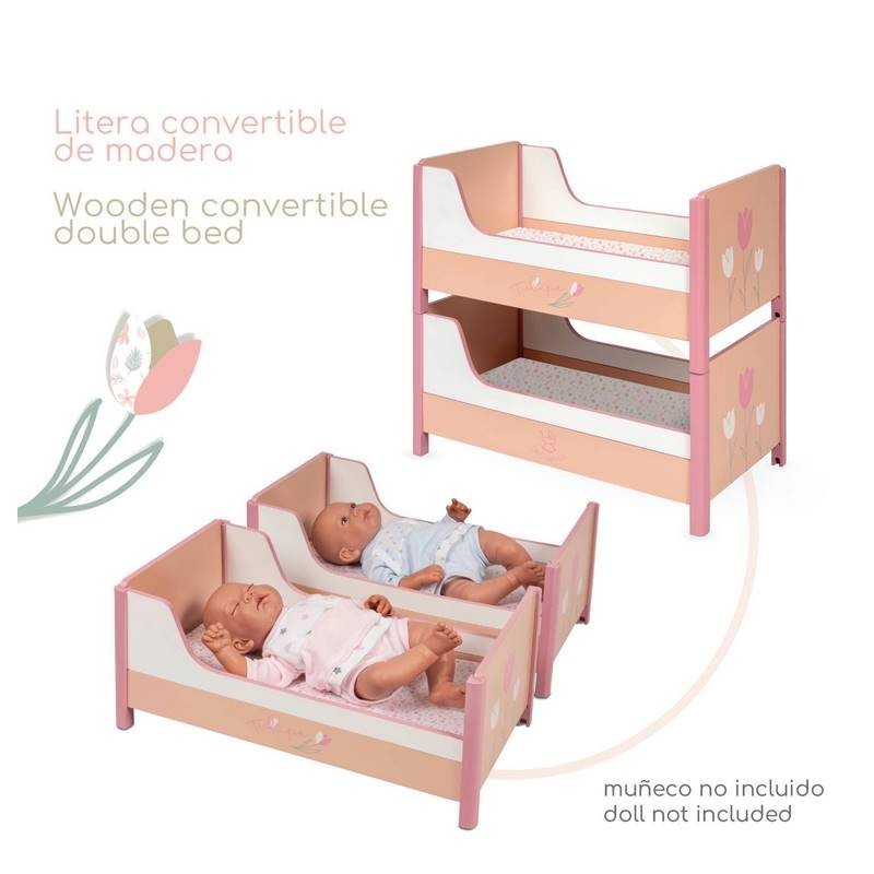 Incluye: 1 litera de madera para muñecas serigrafiada con diseño especial de la colección Tulipe convertible en dos camitas, dos colchones con diseño especial a juego y muchos más detalles de lujo.