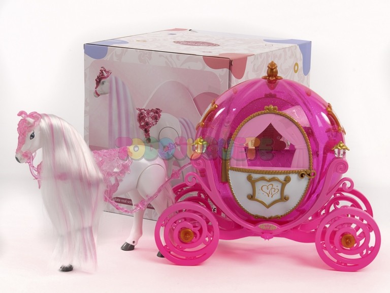 Carruaje para muñeca princesa de color rosa y dorado, con caballo blanco de pelo largo y movimiento de patas.