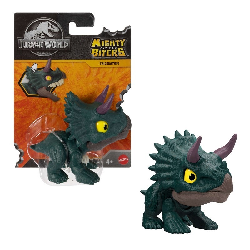 El Jurassic World Mighty Little Biters Ankylosaurus de Mattel es una figura interactiva de dinosaurio que se transforma de una apariencia amigable a una feroz con un simple empujón. Mide aproximadamente 3 pulgadas de largo y altura, este juguete compacto cuenta con un mecanismo de empuje en la cabeza que hace que los dientes superiores se extiendan y los ojos cambien de un aspecto tranquilo a un aspecto agresivo.