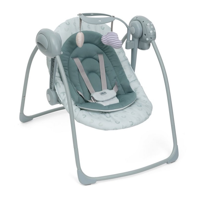 Columpio musical con 12 melodías relajantes, 2 posiciones de reclinado y 5 velocidades de balanceo.