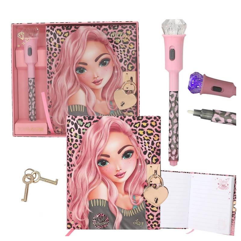 Un set de TOPModel para pensamientos íntimos y secretos. El diario, con colorido estampado animal print y una guapa modelo en la portada, lleva un bonito candado con forma de corazón e incluye dos llaves. El interior consta de páginas con pauta de líneas finas. El bolígrafo a juego escribe con tinta invisible que solo podrá verse al iluminarla con la luz UV del diamante que remata el bolígrafo como topper. Nuevo: las pilas del bolígrafo son recambiables.