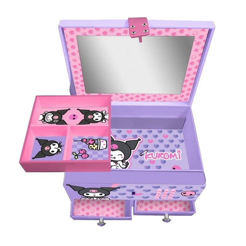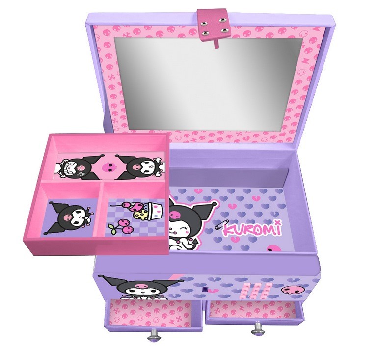 El joyero musical de Kuromi es el complemento ideal para guardar tus joyas y accesorios en tu habitación. Dale el toque de glamour que le falta a tu cuarto con este joyero musical de moda. Tiene todos los compartimentos necesarios para que organices bien tus joyas: bandeja con compartimentos, compartimento escondido grande y cajones. Además, tiene el toque musical de los joyeros de toda la vida, para no perder la tradición. Y esto no es todo... ¡se cierra con código secreto! Tus joyas no habían estado nunca a tan buen recaudo.