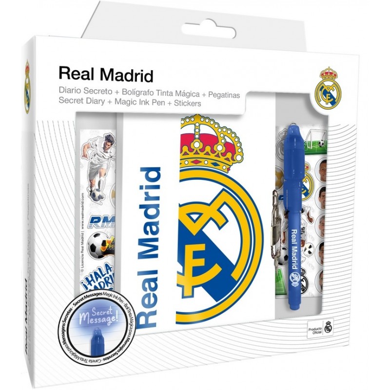 Diario secreto de color blanco con diseño especial del Real Madrid, candado con el escudo del equipo, llave para el candado, 1 bolígrafo de tinta mágica con luz especial y 2 hojas con pegatinas del Real Madrid con la cara de jugadores, el escudo y muchos más detalles geniales.