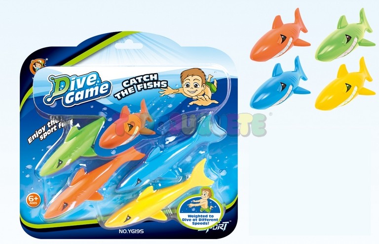 Cada tiburón mide 12 cm y viene en un color diferente, perfecto para identificar el tuyo durante la competición. Sumérgelos, lánzate al fondo y demuestra quién es el más rápido en recuperar su tiburón. Las luces integradas hacen el juego aún más emocionante y fácil de seguir bajo el agua.