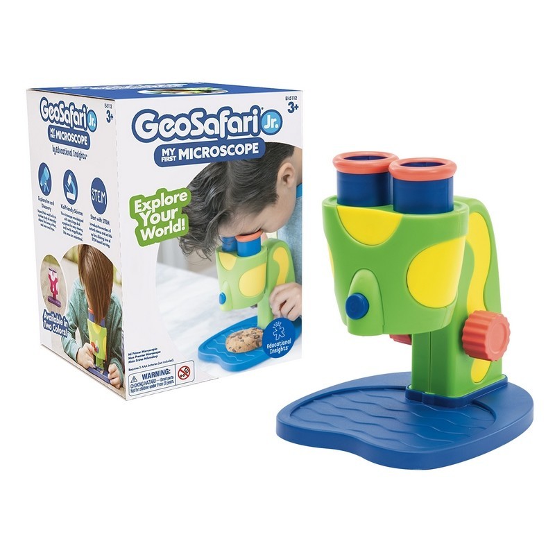 Mi primer microscopio GeoSafari Jr. de Learning Resources. ¡Un microscopio de verdad diseñado para manos pequeñas! Dos mirillas grandes eliminan la necesidad de que el niño cierre un ojo mientras mira por el microscopio. Un ajuste de foco permite enfocar con facilidad para garantizar que los objetos aparezcan de la forma correcta y estén corregidos a derecha e izquierda. Presenta luz LED que permite ver mejor los detalles pequeños. Mide 18 cm x 21 cm (An x Al). Necesita 3 pilas AAA (no incluidas). Idóneo para niños de 3+ años de edad