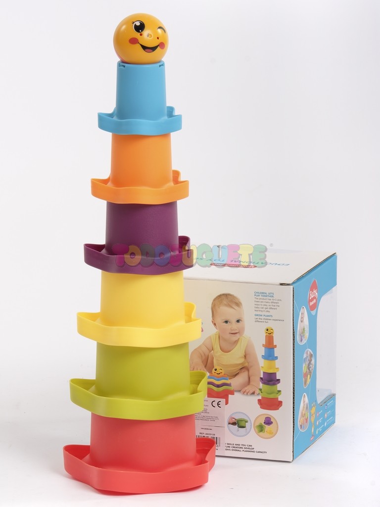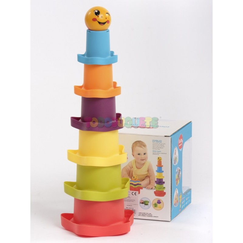 Set de juego para el baño compuesto por 6 cubos apilables en forma de flor/sombrero, y bola con diseño de carita emoji con sonido sonajero.
