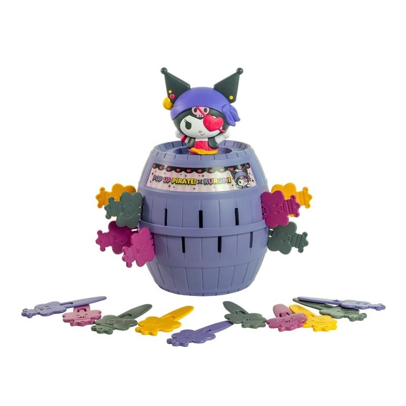 Coloca a Kuromi dentro del barril y ve introduciendo las 24 varillas una a una ¡pero cuidado! En cualquier momento, ¡puede saltar por los aires! Un clásico juego de suspense y risas con el toque rebelde y encantador de Kuromi. Incluye 1 barril, 1 fi gura de Kuromi y 24 varillas.