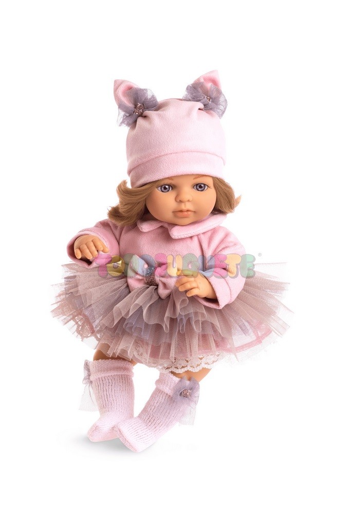 Muñeca de 40 cms con cuerpo articulado que al presionar su barriguita llora y dice mamá y papá.