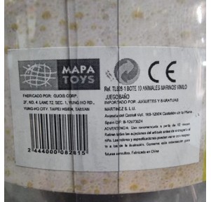 Bote con 10 figuras de vinilo para jugar durante la hora del baño: delfín, tiburon, estrella de mar, pingüino, caballito de mar, pulpo, pez globo...
