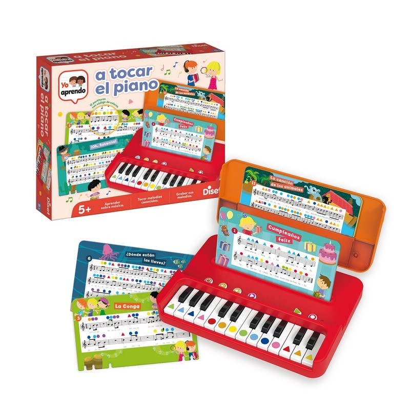 Con este pequeño piano portátil, los más pequeños desarrollan sus habilidades musicales y se inician en el conocimiento de la música, sus notas y partituras. Contiene 12 partituras de canciones populares.