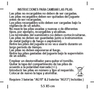 Funciona con 3 pilas AG10 y 2 pilas AG13, todas incluidas, lo que garantiza horas de juego interactivo desde el primer momento.