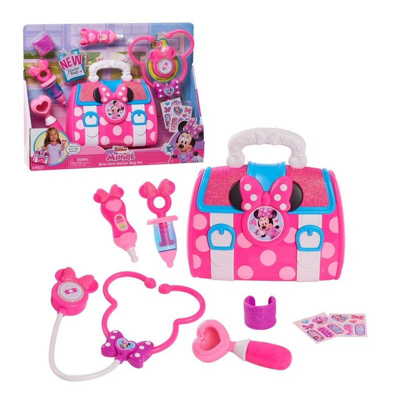 El juego de bolsa de médico Minnie Bow-Care incluye la bolsa de médico de Minnie, un estetoscopio de juguete iluminado, un termómetro de juguete, una jeringa de juguete, un otoscopio de juguete, un vendaje de juguete y 2 hojas de calcomanías.