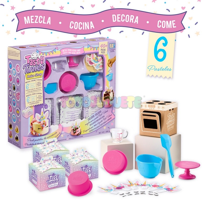 Cocina y decora ¡Mini pastelitos Reales! ¡25 segundos al microondas y listos tus! ¡Solo necesitas añadir agua! Conviértete en el mejor pastelero con Tastie Tinies Unicorn Party Pack. Con sus 37 accesorios podrás crear minipastelitos y deleitarles a todos con tus habilidades culinarias. Con Tastie Tinies. Cada kit incluye paquetes de ingredientes previamente medidos, un recipiente para hornear apto para microondas, y muchísimos accesorios para decorar. Ahora viene lo mejor. ¡Decoradlo! Crea el glaseado, y decora el mini pastelito con la mini espátula. Y dale el toque final con los topping.