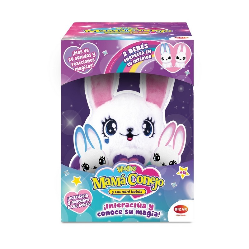 Cuídala con mucho mimo y dale todo tu amor, porque dentro de su barriguita esconde tres sorpresas súper especiales. ¿Estás listo para descubrirlas? ¡Dos mini bebés con orejitas suaves y una mantita para cuidarlos! Pero... ¡shhh! Mamá Bunny solo revelará sus sorpresas cuando sienta que la estás cuidando bien. ¡Interactúa con ella y escucha sus sonidos y reacciones!