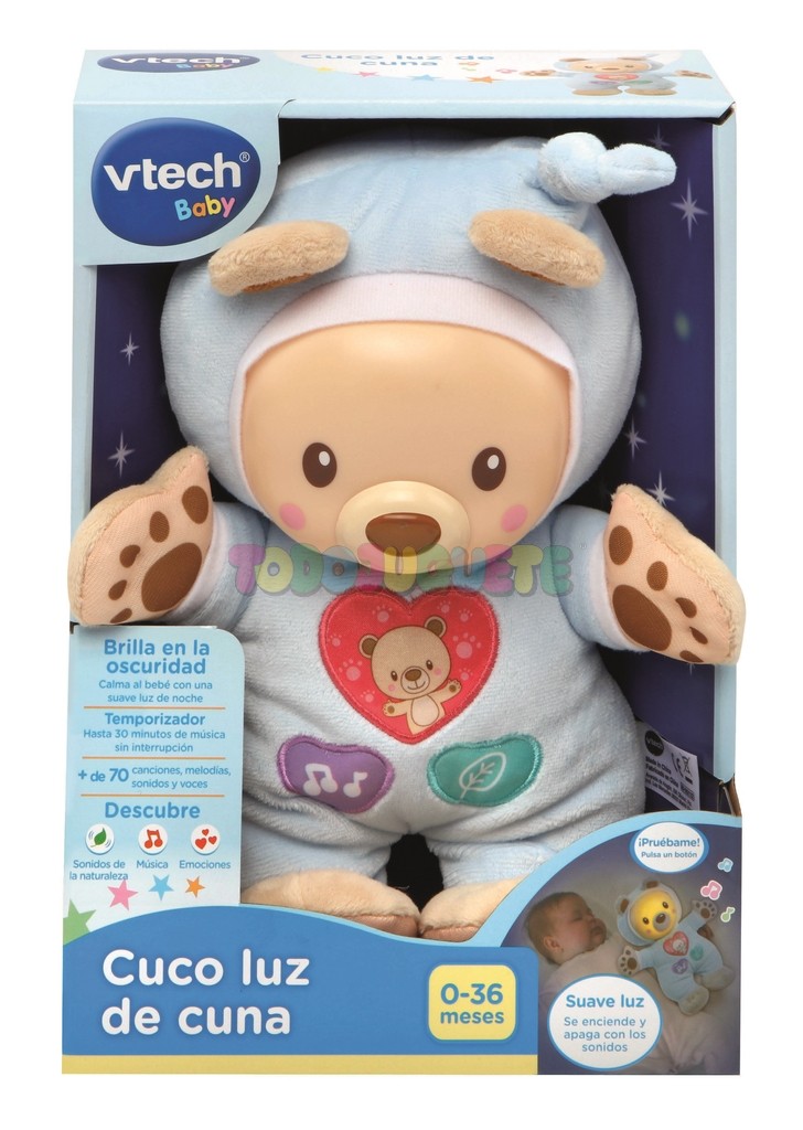 ¡Dulce muñeco con relajantes melodías, canciones y sonidos de la naturaleza que suenan mientras su suave luz de noche se enciende y apaga para ayudar al bebé a calmarse y a conciliar el sueño!