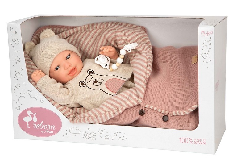 Reborn de 45 cm LAIN. Bebé realista de vinyl y cuerpo blando con ropita de lana con oso, y saco de dormir con tonos a juego. Incluye saco de dormir, chupete, chupetero, pañal, libro de familia y certificado de autenticidad.