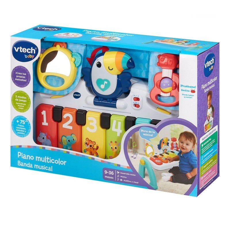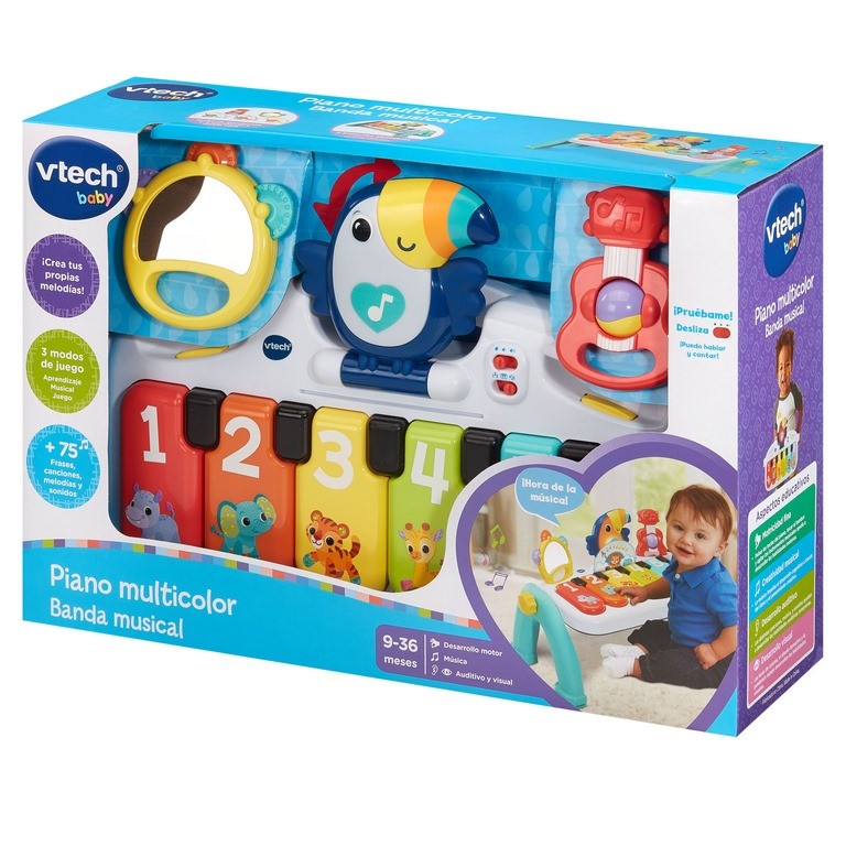 Este gran piano crece con tu peque desde que gatea hasta que da sus primeros pasos. Con las patas montadas invita a tocar de pie; sin ellas se apoya en el suelo para disfrutar boca abajo o sentado, fortaleciendo hombros y la coordinación de ambos lados del cuerpo. Las seis teclas de colores descubren notas, animales, números y colores mientras suenan alegres melodías; cada toque aviva la destreza de los deditos y enseña que sus acciones crean música. El tucán se ilumina al compás y mantiene la atención. Tres mini-instrumentos guitarra-rodillo, pandereta-sonajero con espejo y tres partituras de doble cara aportan texturas, ritmo y la emoción de verse reflejado. La desconexión automática ahorra pilas y asegura sesiones seguras y prolongadas.