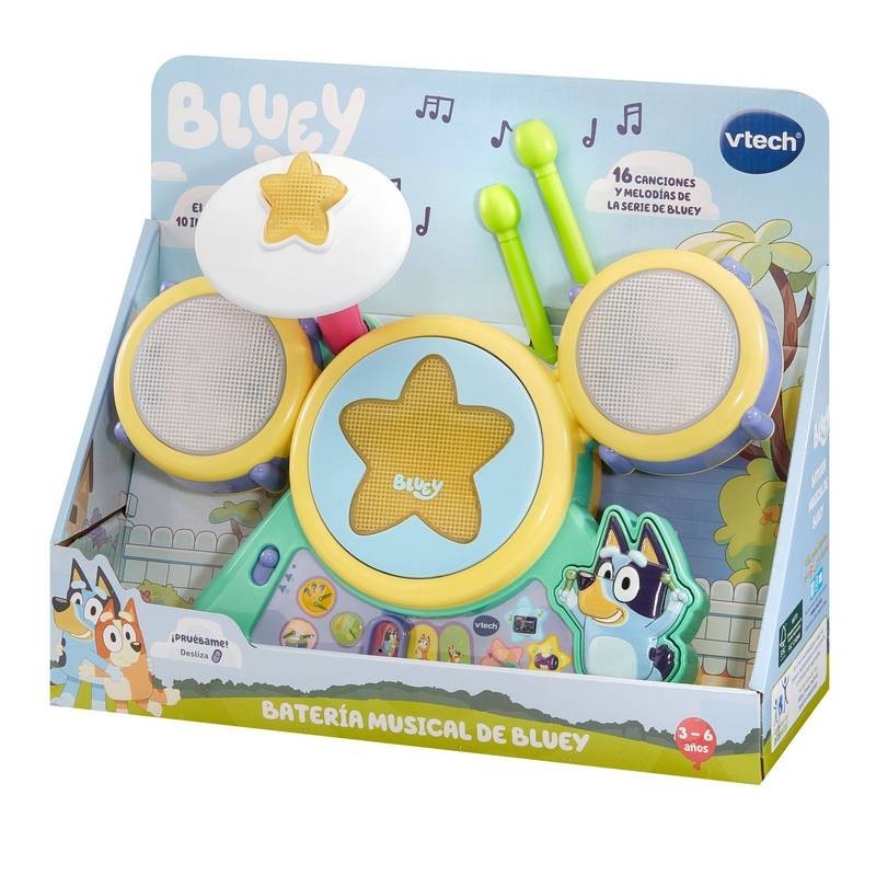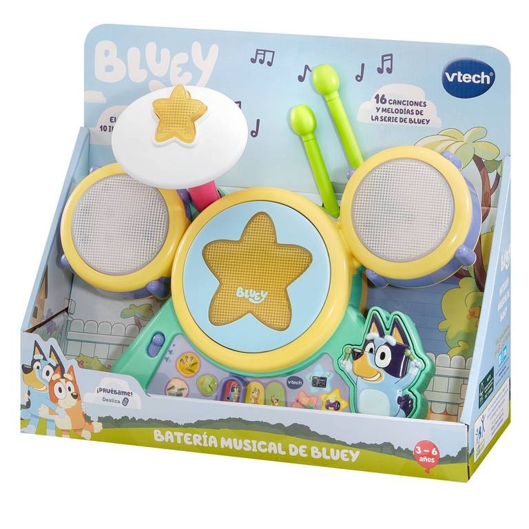 BOTÓN BLUEY Y MÚSICA ORIGINAL Tu hijo podrá escuchar frases y canciones de Bluey, junto a melodías originales que añaden un toque único y emocionante a cada sesión de percusión.