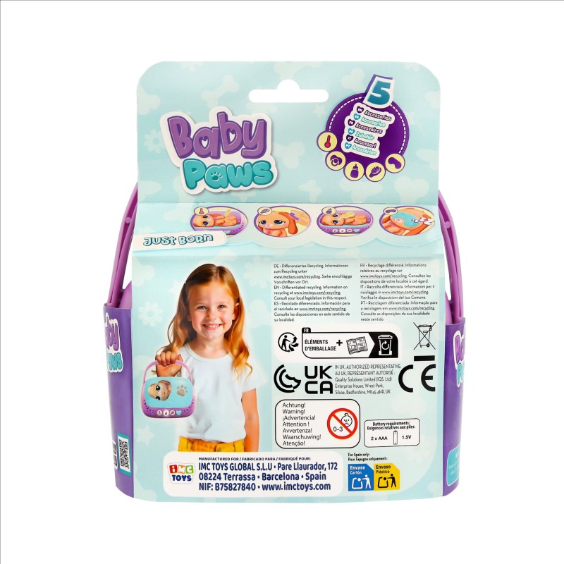 Este Baby Paw es recién nacido. Este adorable bebé necesita de tus cuidados. Presiona el botón con forma de corazón y se iluminará una necesidad, monstrándote lo que debes hacer para hacer feliz a tu Just Born. Toma el accesorio correcto y cuida de tu pequeña mascota. Hay 3 accesorios para las necesidades básicas: una jeringuilla, un biberón y un cepillo.