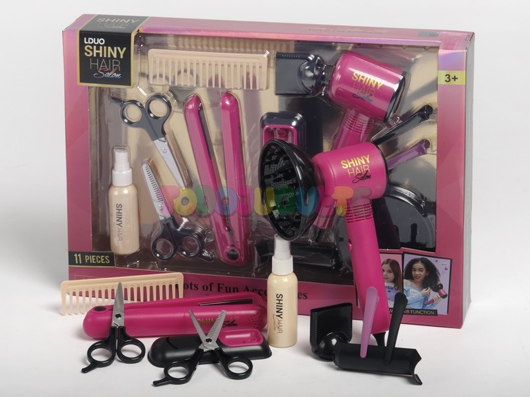 Incluye dos tipos de tijeras, una plancha de pelo, un secador con difusor, pinzas y otros accesorios esenciales para crear peinados únicos.