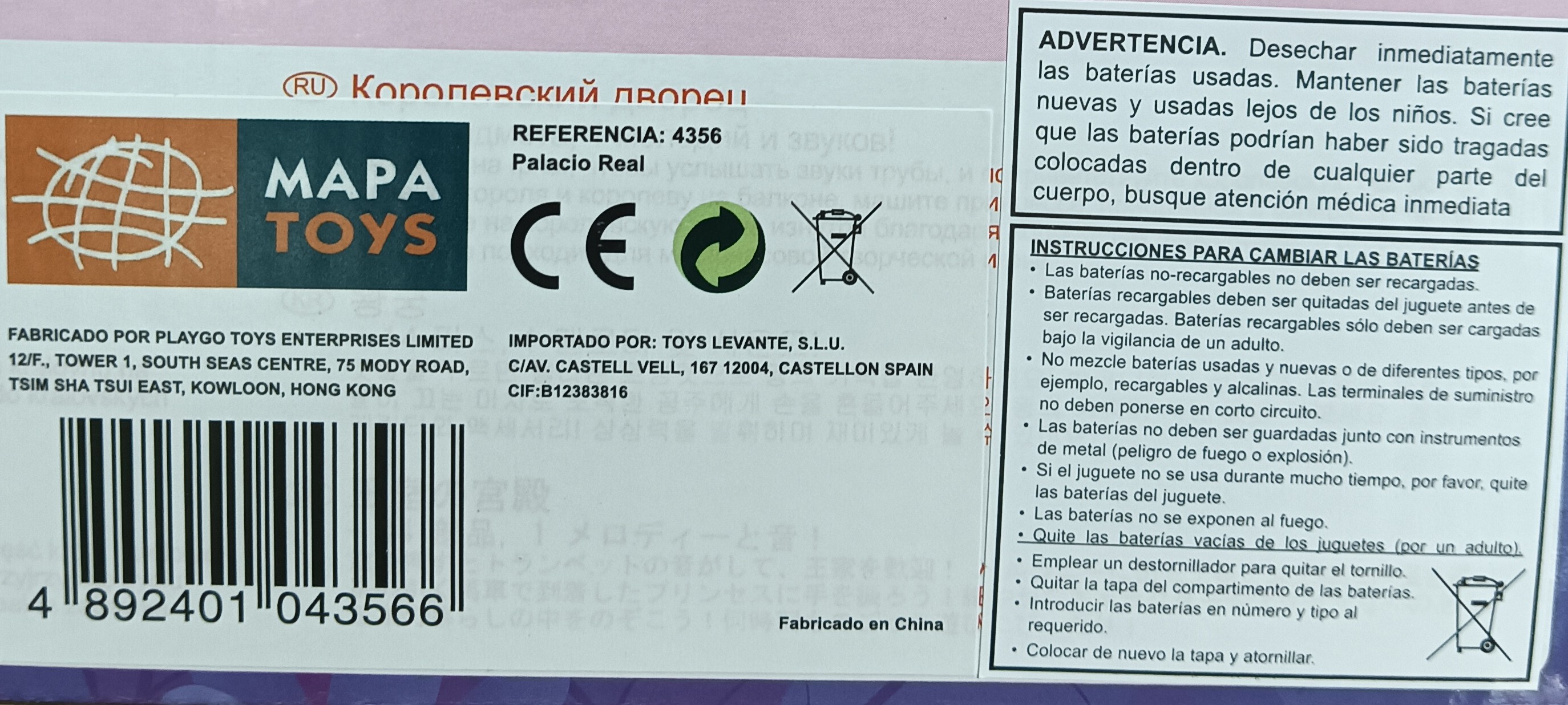 Incluye cuatro personajes rey, reina, príncipe y princesa junto a un caballo y una carroza que enriquecen cada historia. Al pulsar el escudo real se activa la luz y suena la trompeta para dar la bienvenida, mientras los niños pueden vitorear al rey y la reina desde el balcón y recibir a la princesa en su carruaje.