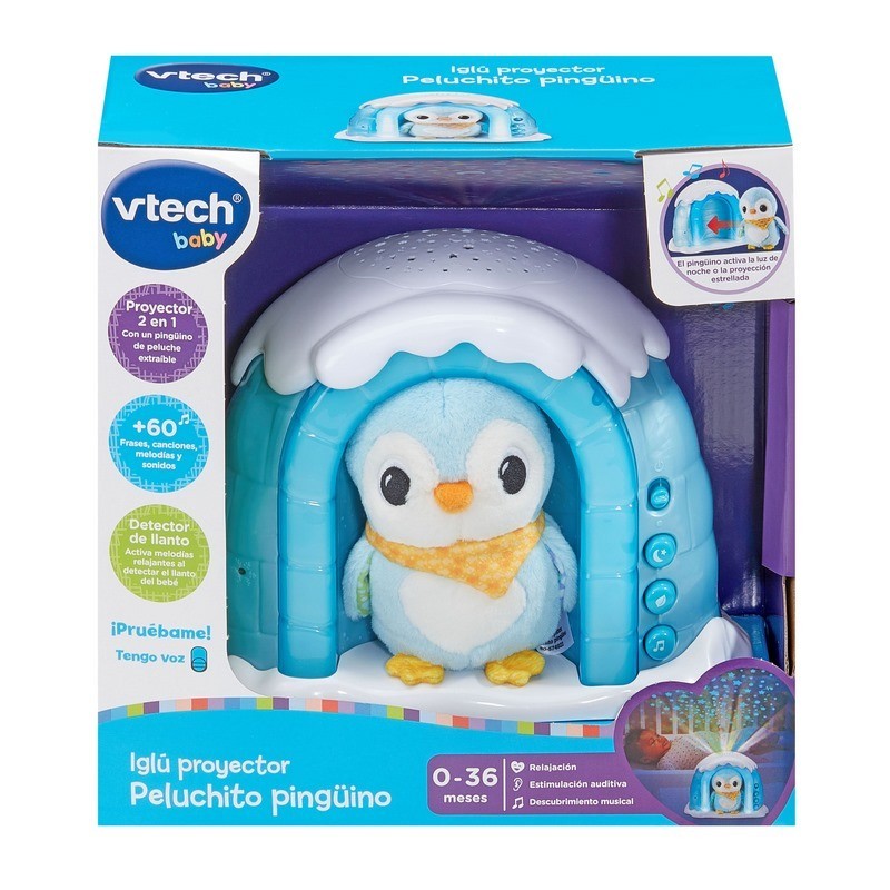 Desde los primeros días, este proyector-iglú con pingüino de peluche llena la cuna de luz y sosiego. Su cúpula lanza un cielo estrellado en cuatro colores que invita al bebé a fijar la mirada y relajarse, mientras el contorno iluminado le da sensación de seguridad. Al colocar o quitar el pingüino, el peque descubre que sus acciones provocan cambios y practica la coordinación ojo-mano. Tres ambientes sonoros melodías diurnas, sonidos de la naturaleza y dulces nanas afinan el oído y animan las primeras vocalizaciones. El temporizador de 15, 30 o 45 min y el sensor de llanto ayudan a reestablecer el sueño; volumen y brillo se ajustan al momento. LED fríos, plástico sin BPA y un peluche lavable garantizan higiene y tranquilidad para toda la familia.