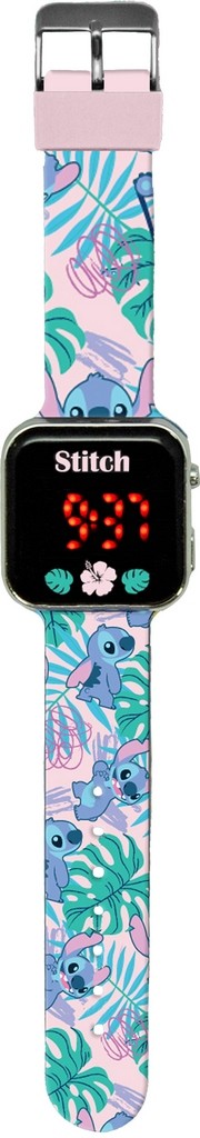 reloj LED infantil con correa de color rosa e imágenes especiales de Stitch, medida ajustable y pantalla digital con dos botones para conocer la hora, los segundos y el día.