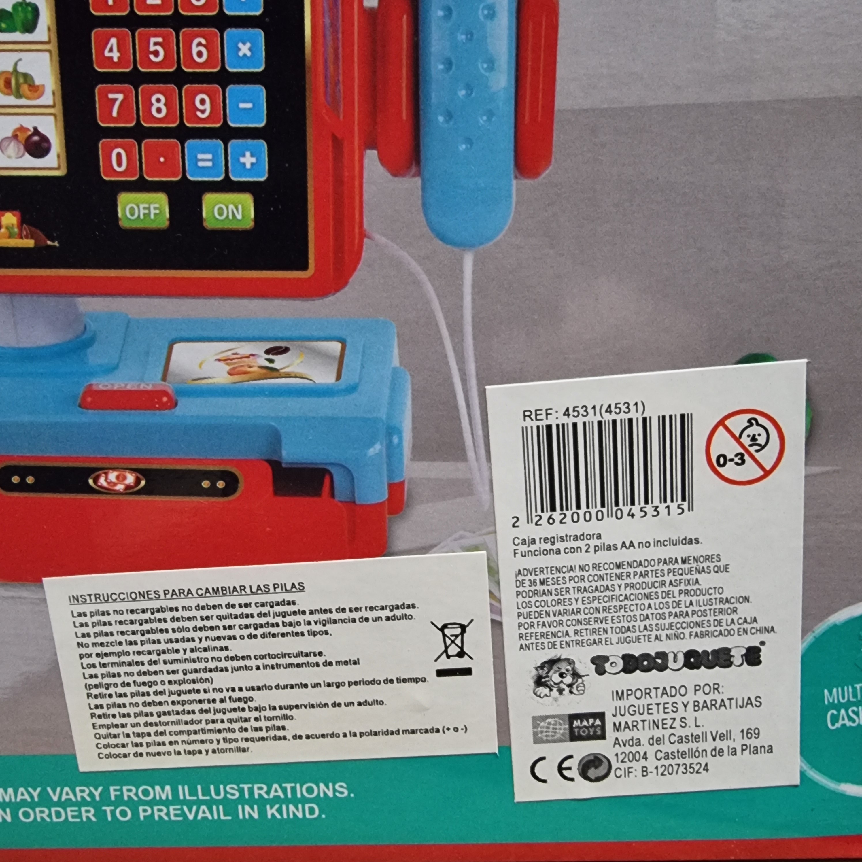 Incluye billetes, monedas y una cesta de alimentos de juguete, lo que permite crear escenarios de compra realistas.