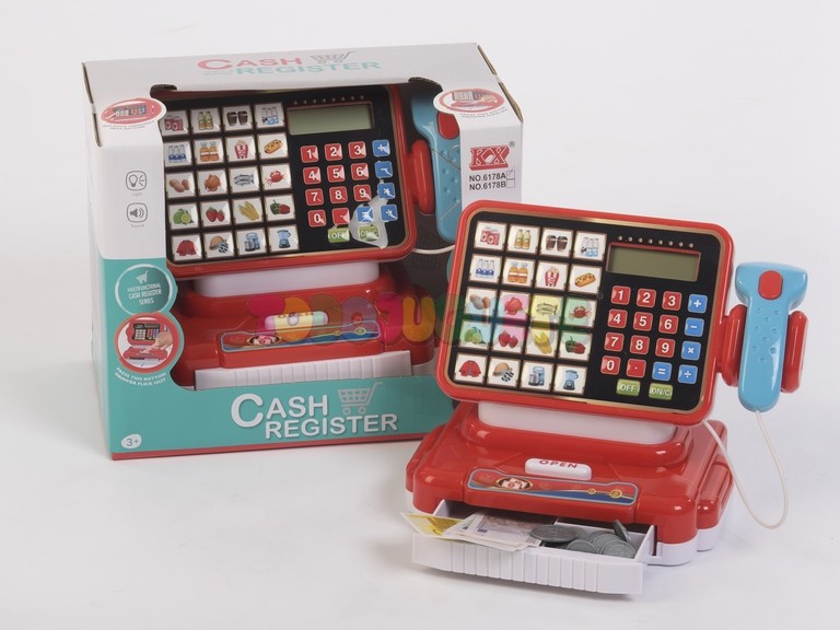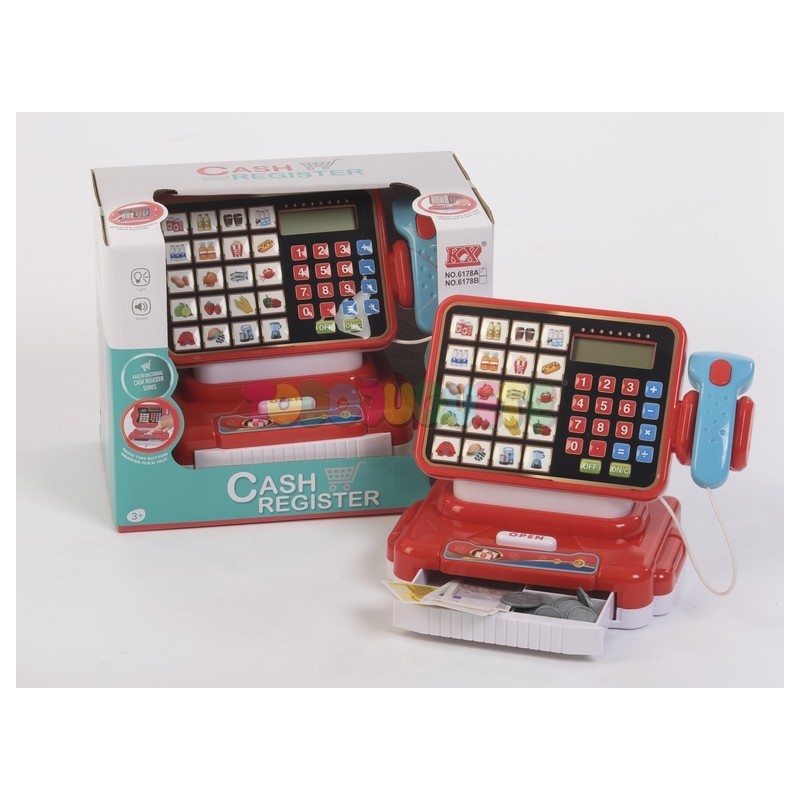 Caja registradora con scanner, billetes y monedas.