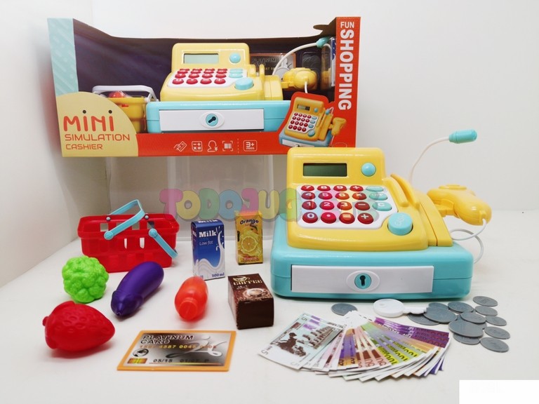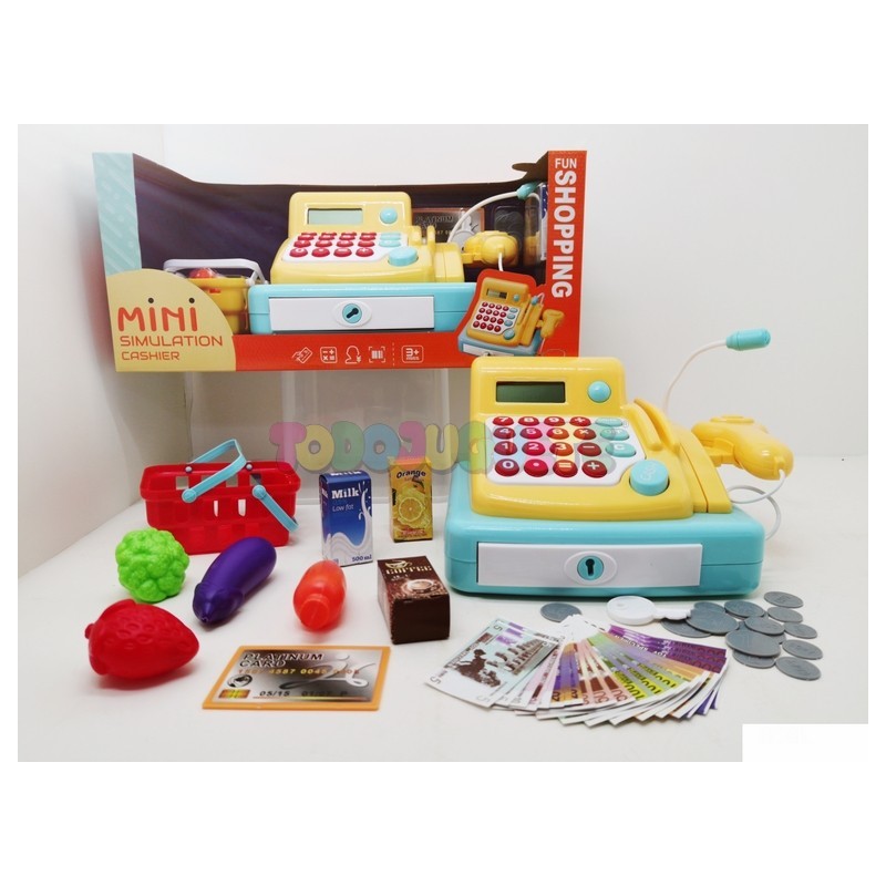 Caja registradora que incluye micrófono, scanner, cesta, alimentos, tarjeta y dinero en efectivo.