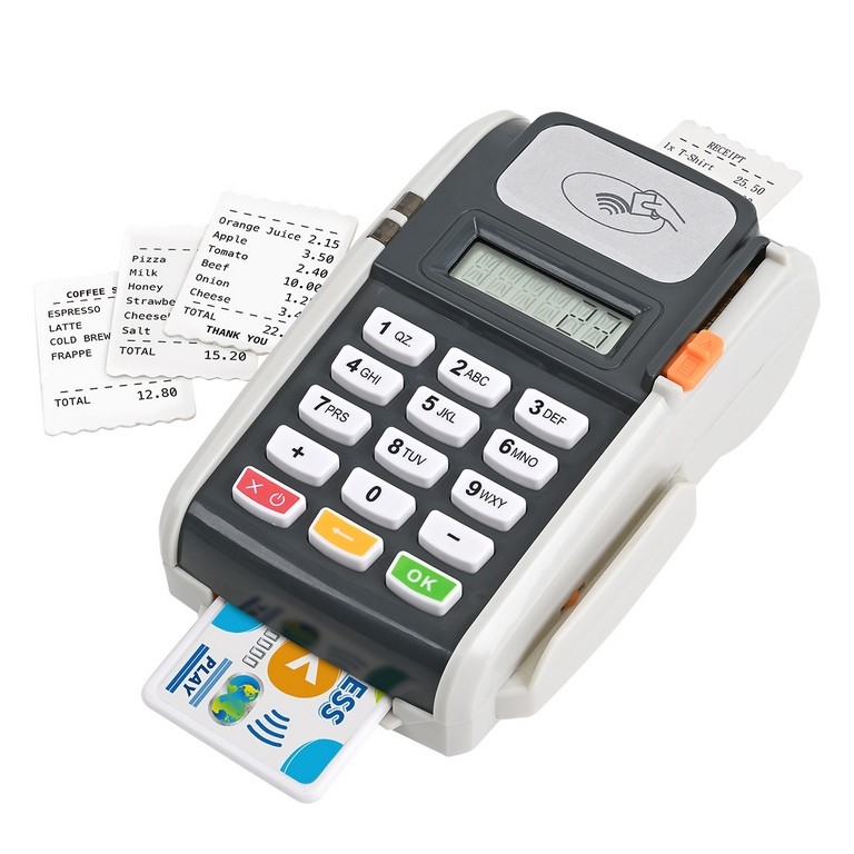 Este datáfono con tickets y tarjeta de pago es un juguete interactivo que permite a los niños simular compras y aprender sobre transacciones de manera divertida.