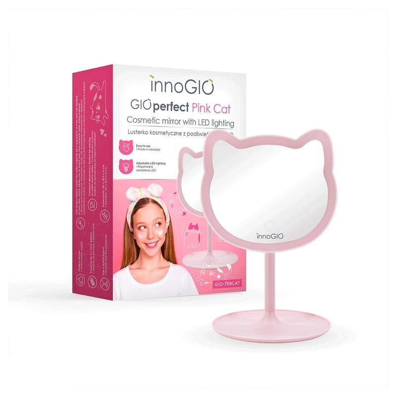 Espejo con una sutil retroiluminación led con forma de gatito o corazón con control táctil y soporte para accesorios.