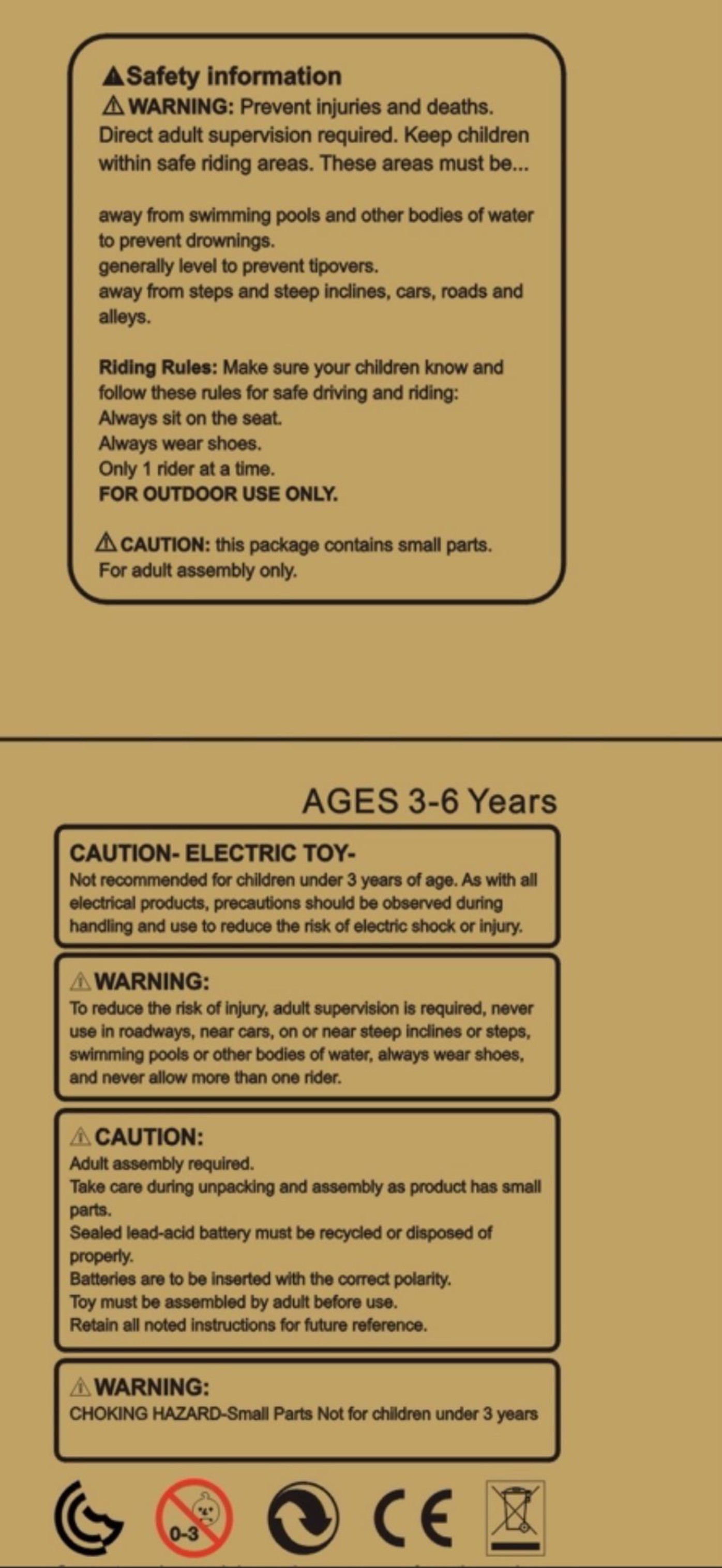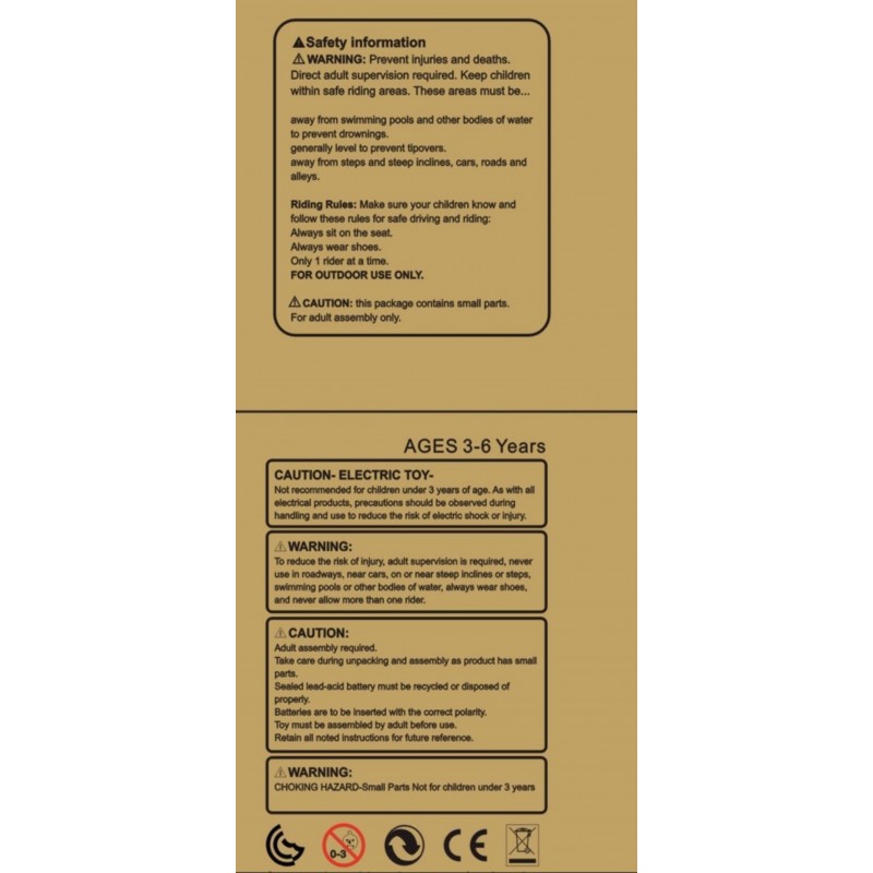 MEDIDAS TOTALES: 107×62,5×44 cm (LxANxAL). Medidas del asiento: 32×19 cm (LxAN). Adecuado para niños de 3 a 6 años. Peso máximo soportado: 30 kg. Certificaciones: EN 71-1-2-3, EN 62115. Se requieren 2 pilas AAA (no incluidas)