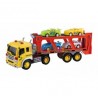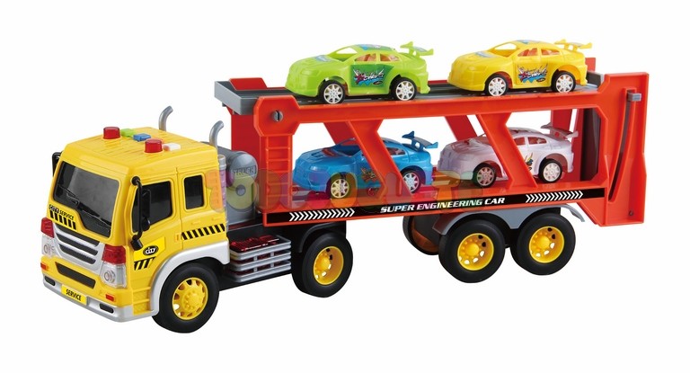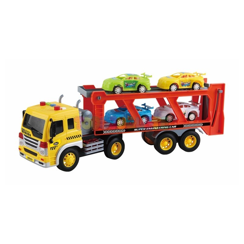 Camión trailer portacoches a escala 1:16, con luz, sonidos y ruedas a fricción.