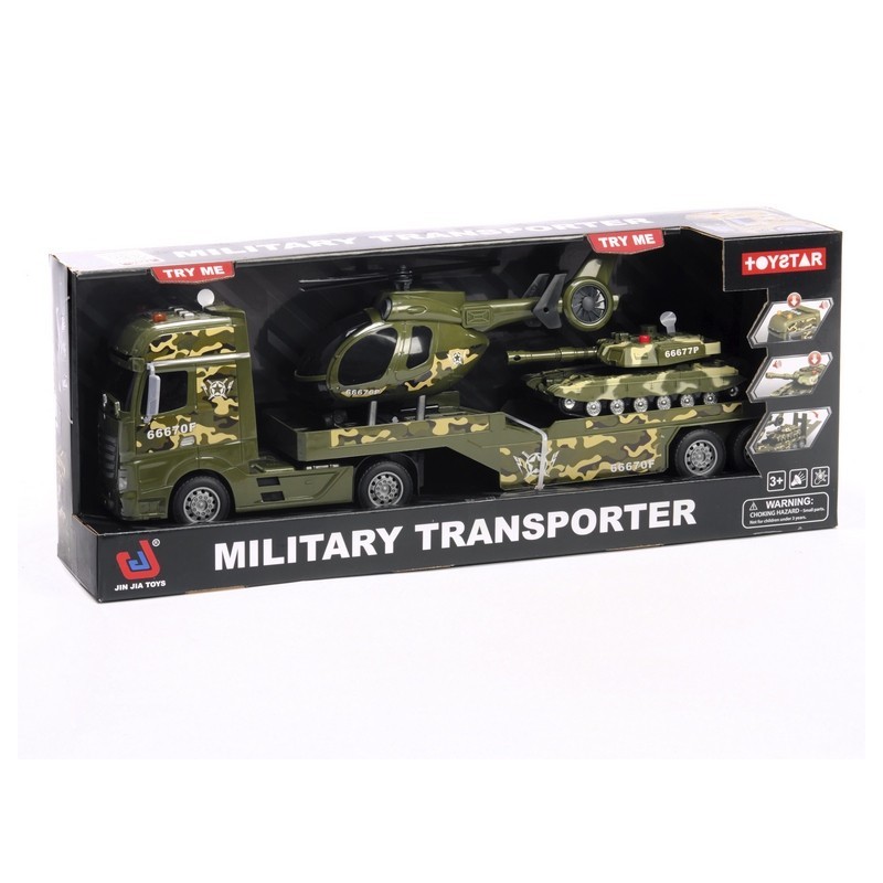 Camión tráiler militar transporta vehículos con rampa trasera, perfecto para los pequeños fanáticos de la acción.