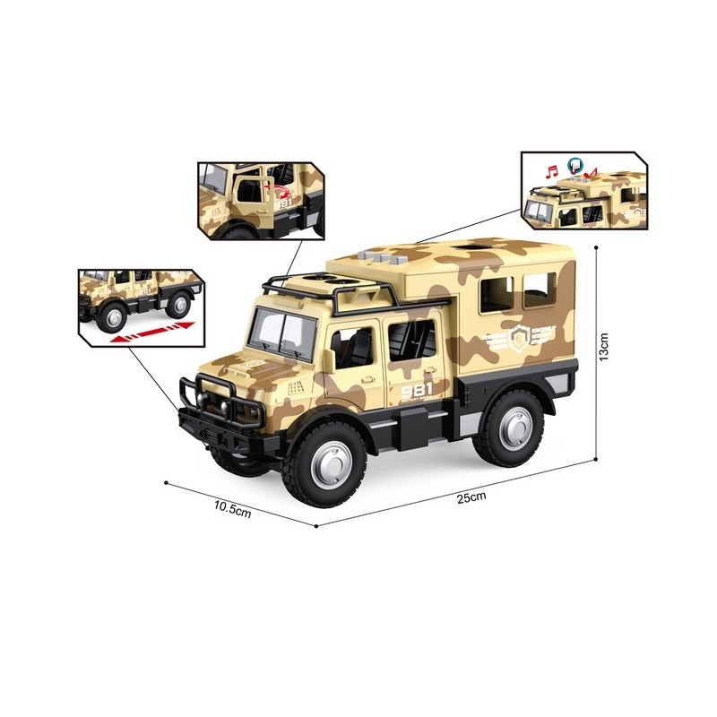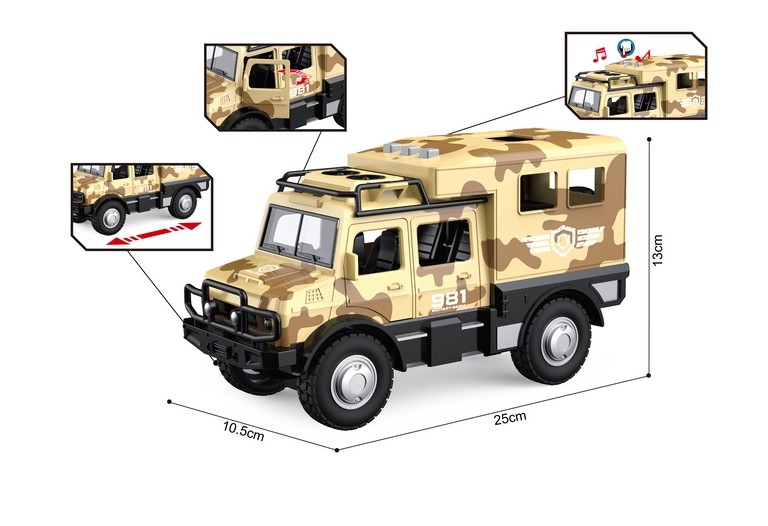 Camión Militar de 26 cm con ruedas a fricción y puertas que se abren y se cierran.