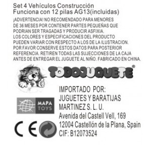 Cada vehículo funciona con 3 pilas AG13, incluidas para que los niños puedan comenzar a jugar de inmediato. Ideal para estimular el juego simbólico, la coordinación y la imaginación.
