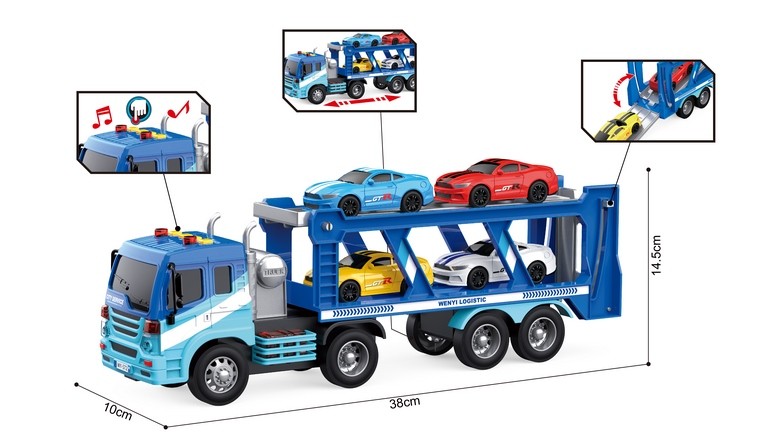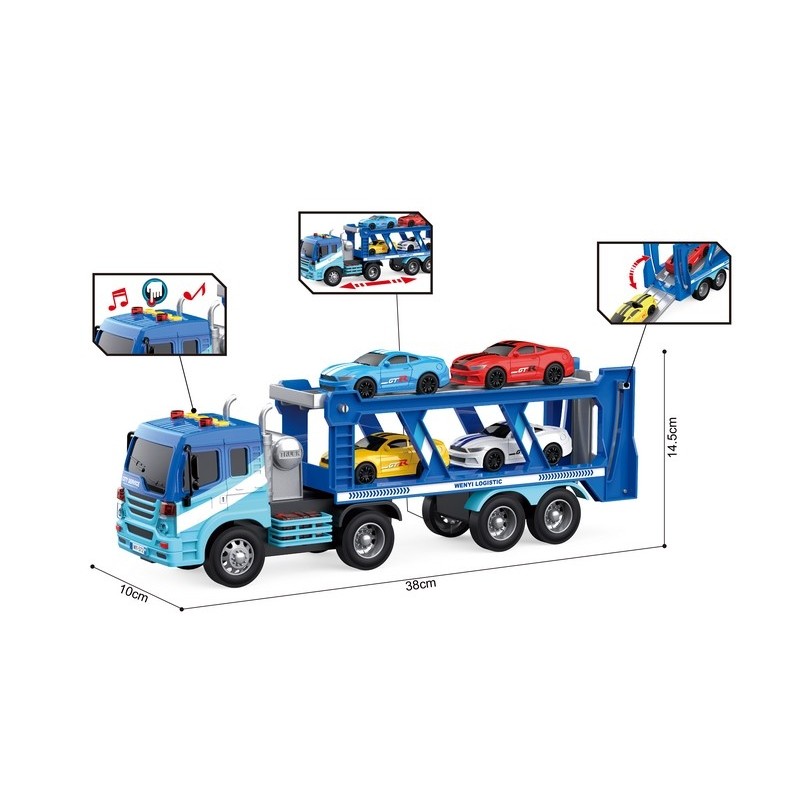 Camión Portavehículos de 38 cm con ruedas de fricción, luz y sonidos + 4 coches.
