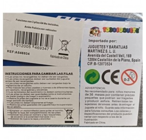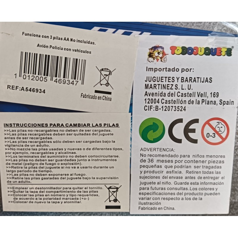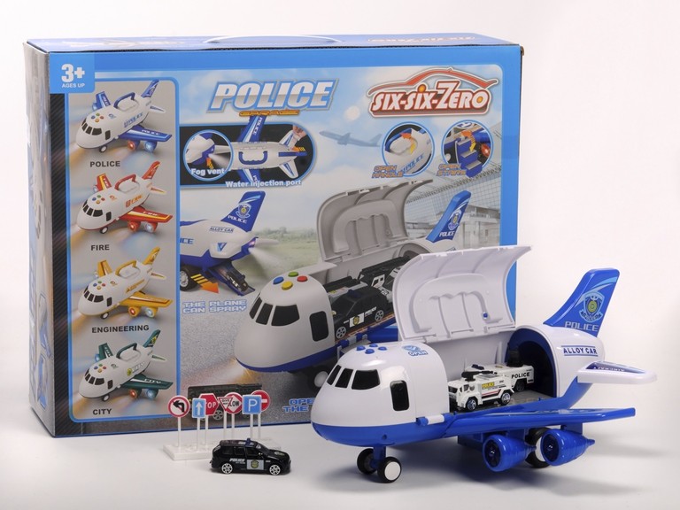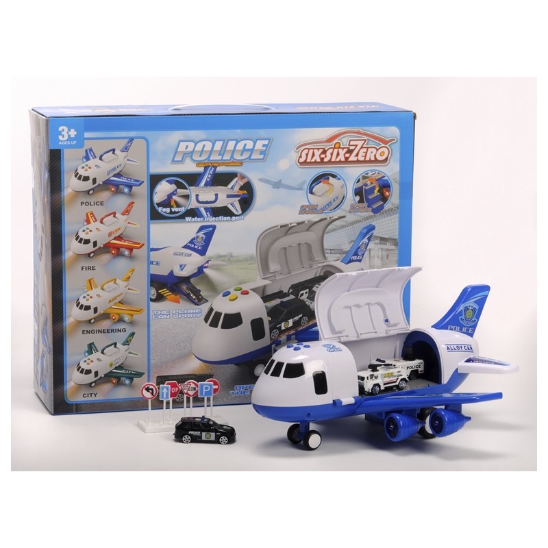 Avión Policía con luces y sonido, ideal para niños a partir de 3 años, con capacidad para transportar 4 vehículos.