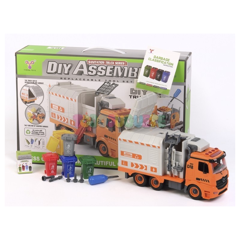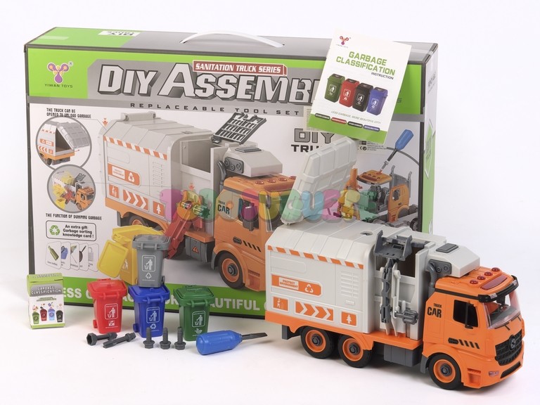 El set incluye cuatro contenedores para el reciclaje, junto con 40 tarjetas que representan productos que los niños pueden clasificar en el contenedor correspondiente, promoviendo el aprendizaje sobre el reciclaje real. Además, el camión incluye tornillos y un destornillador con varias puntas para que los niños puedan montar y desmontar el vehículo, fomentando el desarrollo de habilidades manuales.